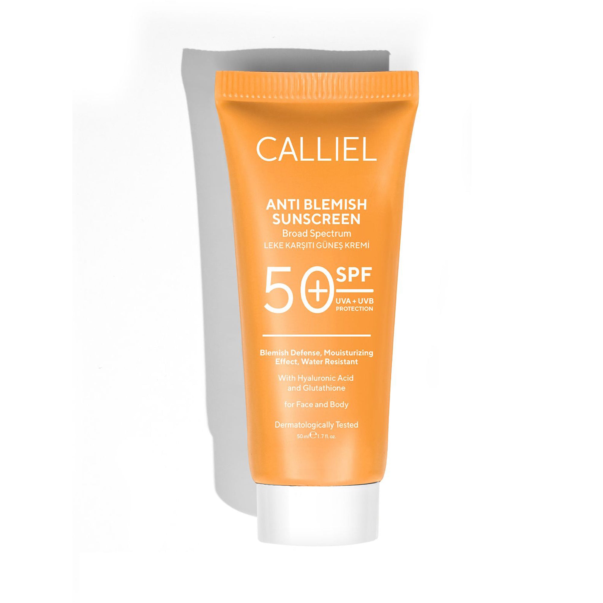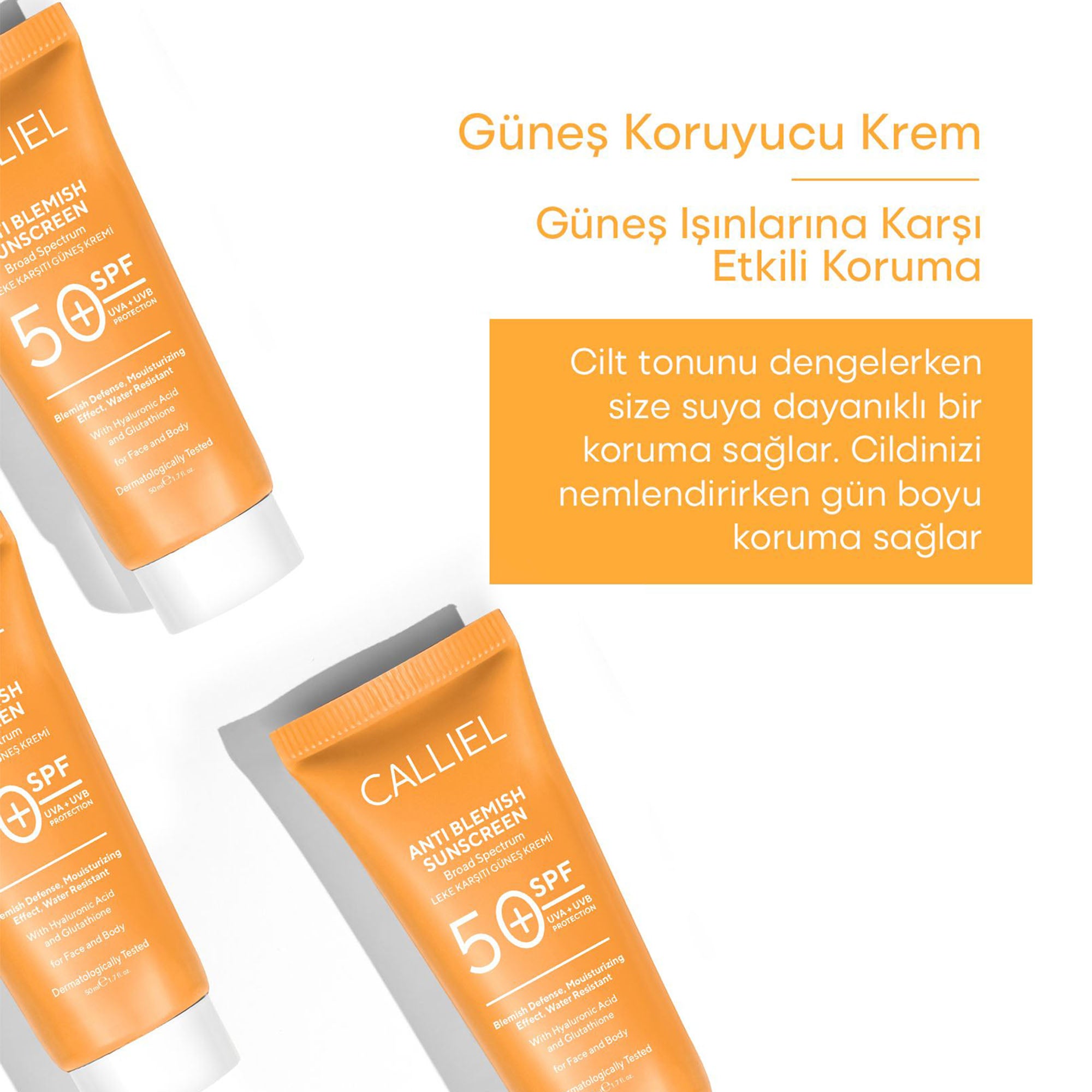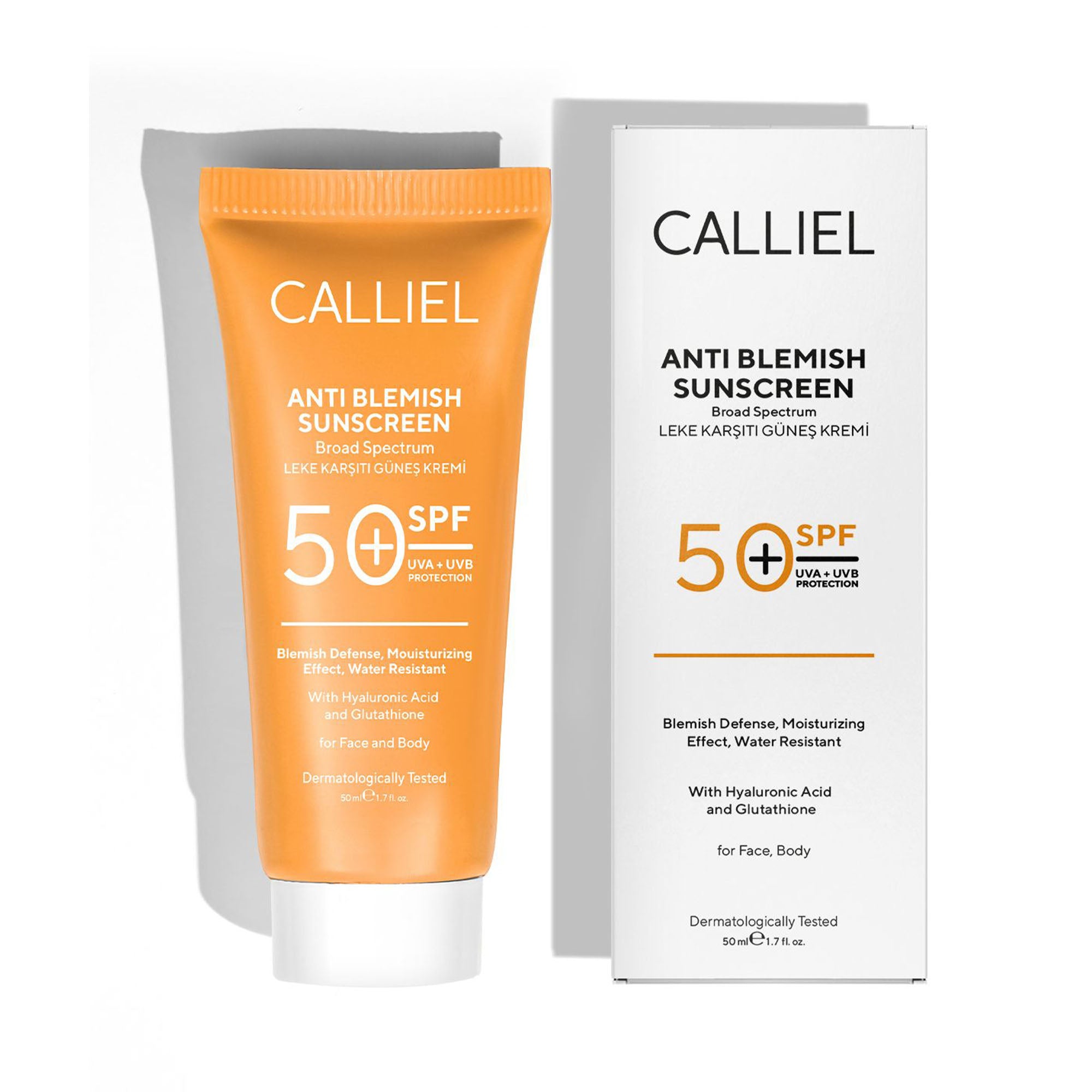 Calliel Akne ve Leke Önleyici Güneş Kremi SPF 50+ ile Leke ve Akne oluşumuna yatkın ciltler için güneşin zararlı ışınlarına karşı yüksek koruma sağlar. Formülünde bulunan Alpha Arbutin; kızarıklık, güneş, yaşlılık ve akne lekeleri karşı oldukça etkilidir. Cilt tonunu eşitler ve yeni leke oluşumunu önler. SPF 50+ ile güneşin güçlü ve şiddetli ışınlarına karşı mükemmel bir bariyer oluşturur. Niacinamide, Seramid ve Hyalüronik Asit ile güneşin neden olabileceği hassasiyet ve kızarıklığı önler, besler ve nemlendirir.